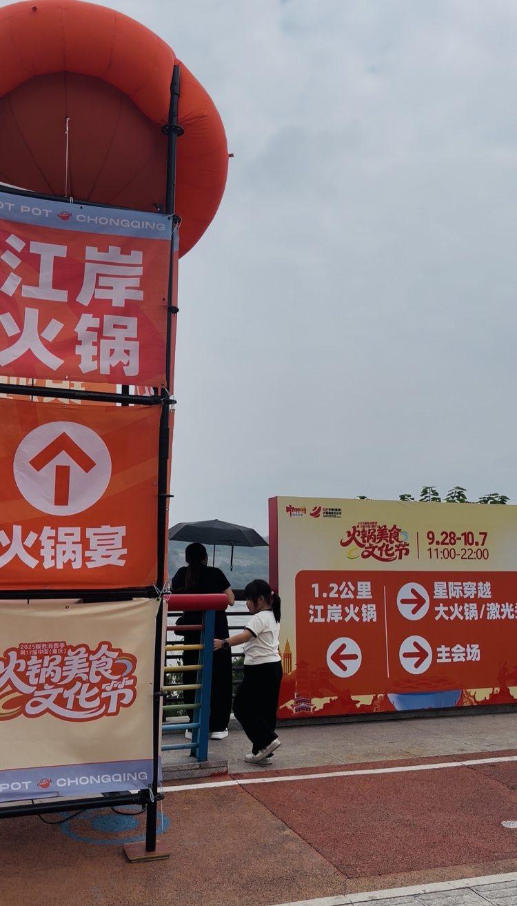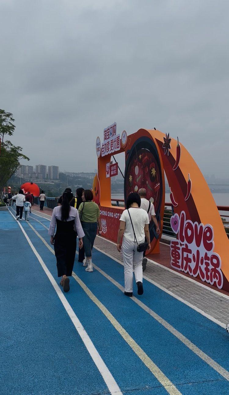 大渡口区实验小学三年级的小彭同学早早地和爸爸妈妈一起,来到白居寺长江大桥“水滴”形状的桥墩处拍照打卡。 “听说这里正在举行重庆火锅美食文化节,我们就一起来打卡这场热辣滚烫的火锅盛宴。”